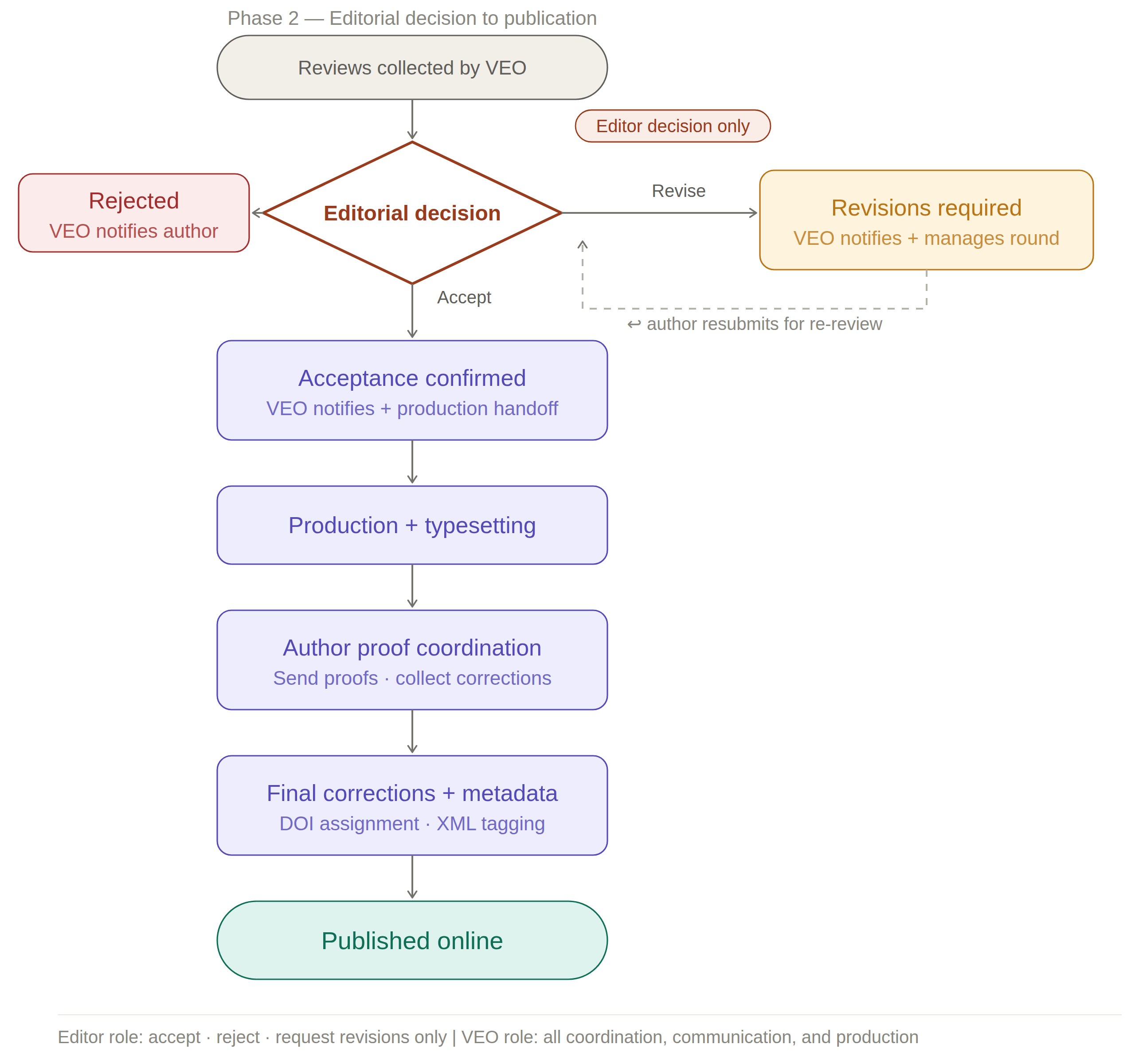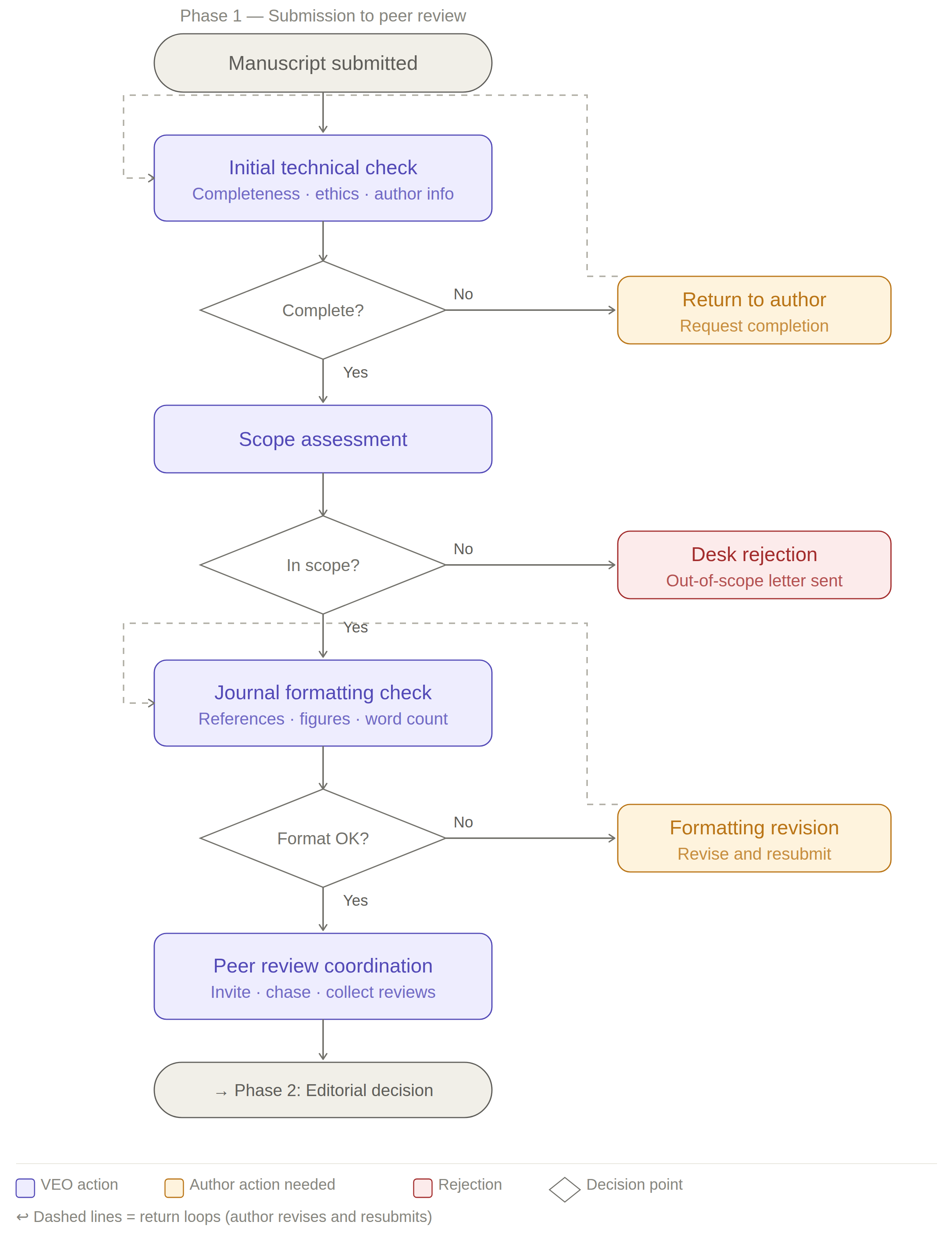 Every manuscript passes through two broad phases. In Phase 1, the VEO determines whether the manuscript is ready for peer review — covering completeness, scope, and formatting. In Phase 2, the manuscript enters peer review, the editor makes the editorial decision, and the VEO manages everything that follows, all the way through to publication.